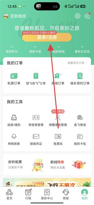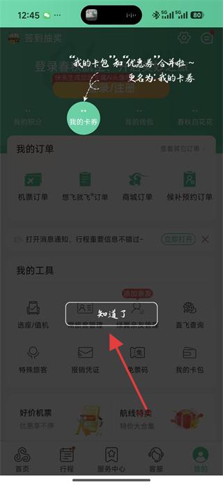 1、打開春秋航空APP,進入我的頁面,彈出我的卡包和優惠卷合并的通知點擊知道了。