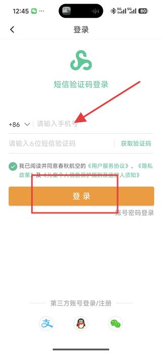3、在登錄界面選擇短信驗證碼登錄,輸入手機號碼,獲取驗證碼后輸入,勾選用戶服務協議等,點擊登錄按鈕。