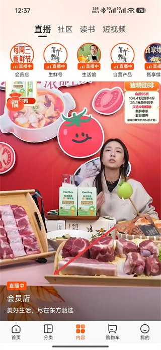 1、打開東方甄選app,進入直播頁面,查看當前直播的商品推薦,點擊直播畫面進入直播詳情頁,參與互動或查看商品。