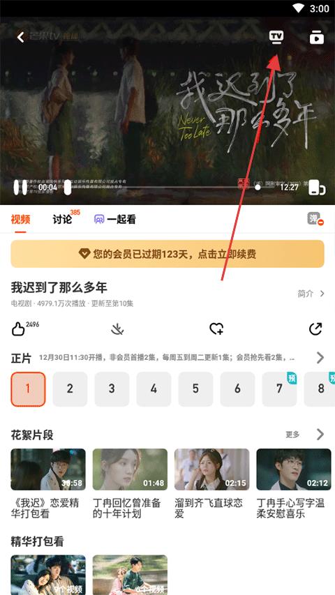 1、芒果TV安卓版播放頁,點擊右上角TV圖標,可搜索電視設備,將當前播放的劇集投屏到電視,大屏觀看更沉浸。