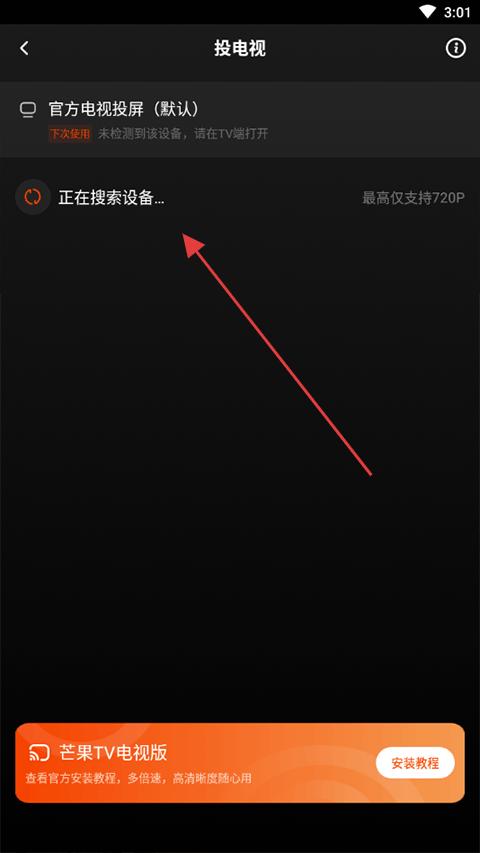 3、投電視界面,選擇官方電視投屏,app自動搜索可連接的電視設備,完成配對后,就能推送內容到電視端播放。