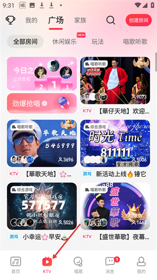 2、KTV頁面有全部房間、休閑娛樂等分類,展示華仔天地等多樣唱歌房間,支持創建房間,滿足不同唱歌場景需求。