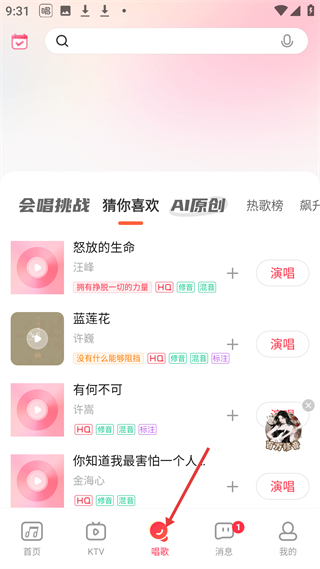 3、唱歌頁面設猜你喜歡等欄目,推薦怒放的生命等歌曲,提供演唱選項,還有AI原創等特色板塊豐富體驗。