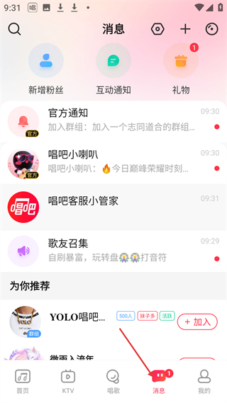 4、消息頁面可查看新增粉絲、互動通知等,有官方通知、唱吧小喇叭等消息,還推薦群組,助力用戶拓展歌友圈。