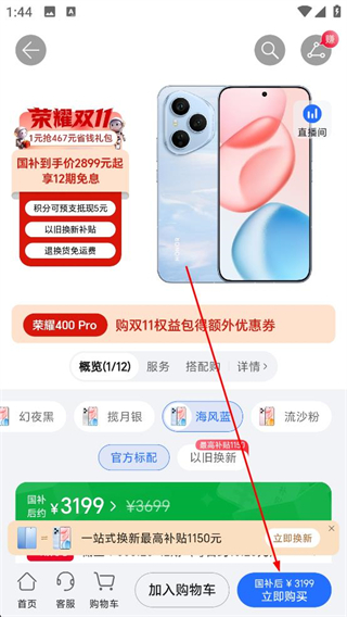 3、在榮耀400Pro手機詳情頁,可查看手機顏色、價格和以舊換新服務,點擊立即購買可進入支付頁面。