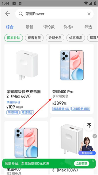 2、在搜索結果頁面可查看榮耀超級快充充電器、榮耀400Pro手機等商品,選擇榮耀400Pro手機點擊進入詳情頁。