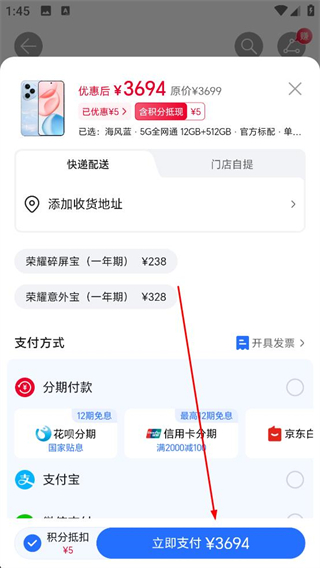 4、在支付頁面可選擇收貨地址、碎屏險和支付方式,確認信息無誤后點擊立即支付,完成手機購買。