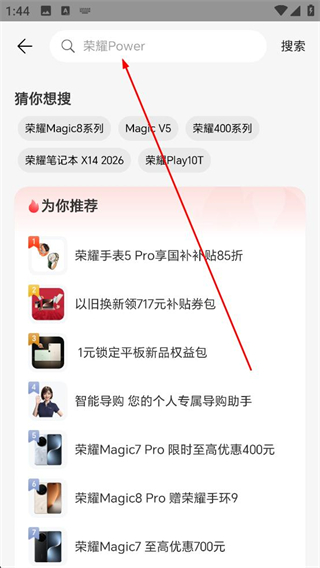 1、進入榮耀商城搜索頁面,在搜索框輸入關鍵詞,可查看猜你想搜和為你推薦的商品,如榮耀手表、以舊換新補貼包等。