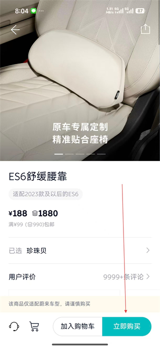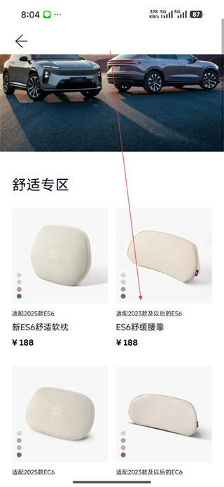 2、在商品列表中選擇ES6舒緩腰靠,點擊進入該商品的詳情頁面,查看適配車型價格及產品介紹等信息。