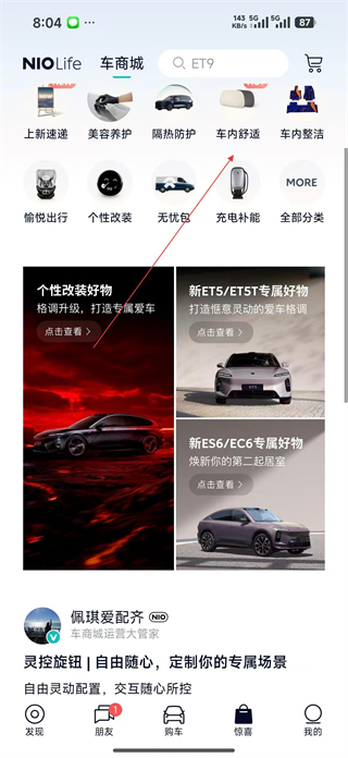 1、打開蔚來app進入驚喜頁后瀏覽分類板塊,選擇車內舒適分類,點擊進入對應的商品列表頁面,查看相關車載用品。