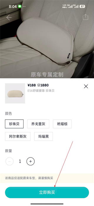 4、選好商品規格和數量后,點擊立即購買按鈕,可進入結算流程,完成該車載腰靠的購買。