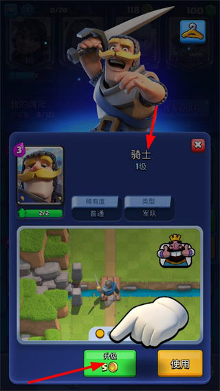 1、對卡牌進行升級,如騎士卡牌,消耗金幣提升等級,增強卡牌戰力,助力對戰。