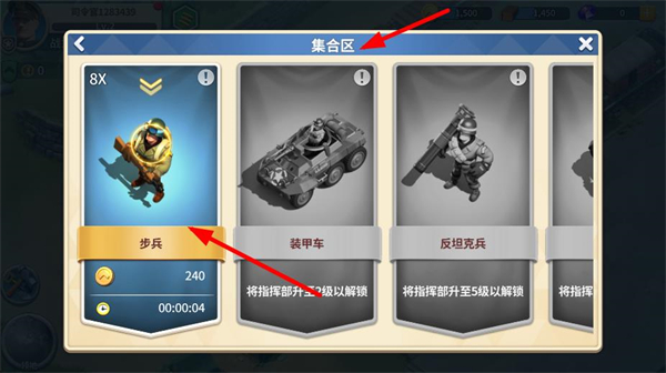 2、在集合區選擇部隊如步兵進行訓練,消耗資源和時間,提升部隊數量和質量,為戰斗和資源掠奪做準備。