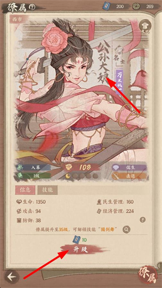 2、查看公孫大娘的屬性,包括生命攻擊等數值,消耗對應道具點擊升級按鈕,提升該僚屬的等級與能力。