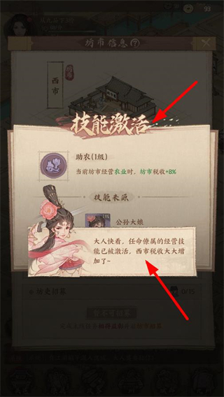 1、觸發技能激活,僚屬公孫大娘的經營技能激活后,當前坊市經營農業時,坊市稅收會獲得加成。