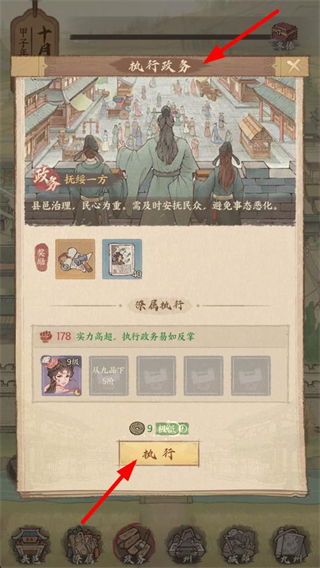 3、選擇撫綏一方任務,查看任務要求后,選定對應僚屬,點擊執行按鈕讓僚屬完成任務獲取反饋。