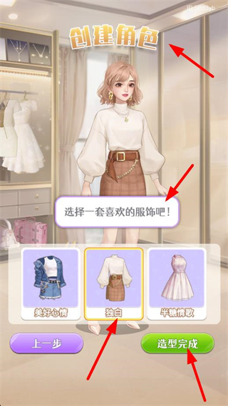 1、創建角色時可選擇喜歡的服飾,如獨白等套裝,選好后點擊造型完成按鈕,確定角色造型。