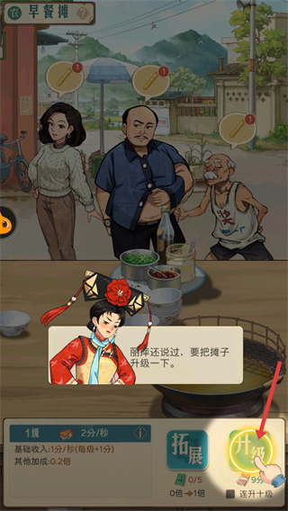 4、經營一段時間后,可對早餐攤進行升級,點擊升級按鈕,提升攤位的收入和其他屬性,助力更好經營。