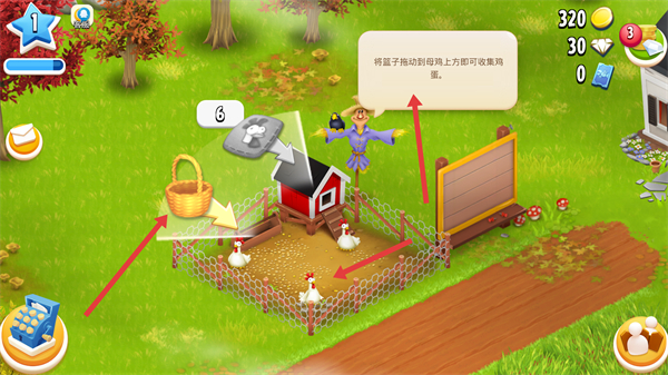 1、養殖母雞后,等待雞蛋生產時間結束,可收集雞蛋,收集時將籃子拖到雞舍上方,獲取雞蛋資源,用于農場經營。