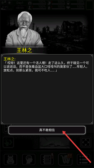 4、遇到王林之后,點擊真不敢相信按鈕,推進與王林的對話劇情,了解更多末日生存信息。