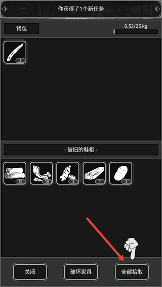 2、搜索后進入背包界面,可選擇全部拾取獲得的物資,背包有重量限制,合理拾取助力末日生存。