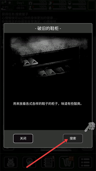 1、遇到破舊的鞋柜時,點擊搜索按鈕,可對鞋柜進行搜索,了解其描述同時有機會獲得物資。
