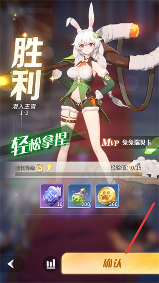 2、戰斗勝利后顯示勝利界面,可獲得鉆石、金幣等獎勵,點擊確認按鈕繼續游戲,開啟新的冒險。