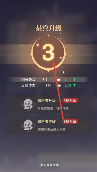 3、團長等級提升時會顯示恭喜升級界面,等級提升后體力等屬性增加,還會開啟冒險者升級等新功能。