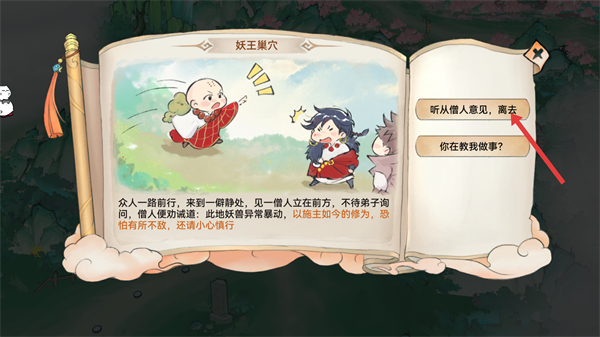 4、遇到劇情事件,比如在妖王巢穴,會有不同的選項,選擇聽從僧人意見,離去等,推動劇情發展,影響游戲走向。