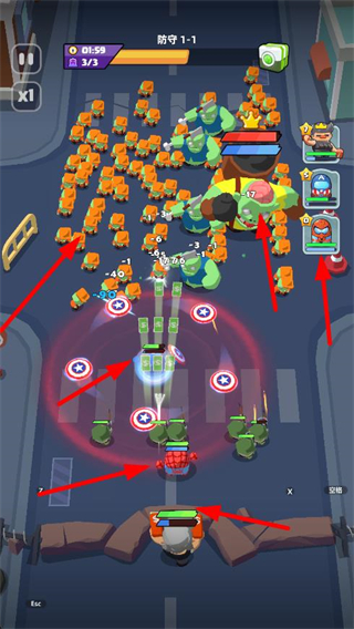 3、與助陣英雄和友軍協同作戰,共同攻擊大量僵尸,通過配合提升傷害輸出,抵御僵尸進攻。