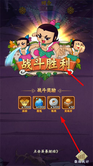 3、戰斗勝利后可獲得經驗、銅錢、銀兩、突破丹等獎勵,點擊屏幕繼續,可開啟新的戰斗或劇情。