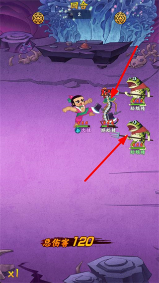 2、操控葫蘆娃攻擊妖怪,如妙蛙精,通過攻擊造成傷害,每回合積累傷害,逐步擊敗敵人。