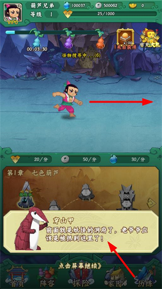 1、跟隨穿山甲的指引,前往妖怪洞府,點擊屏幕繼續推進劇情,開啟拯救老爺爺的冒險之旅。