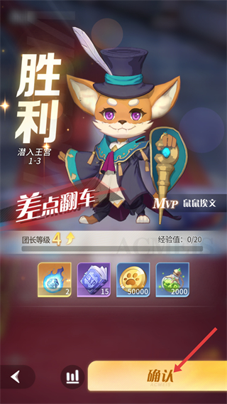 1、戰斗勝利后顯示勝利界面,可獲得鉆石、金幣等獎勵,點擊確認按鈕繼續游戲,提升團長等級,開啟新冒險。