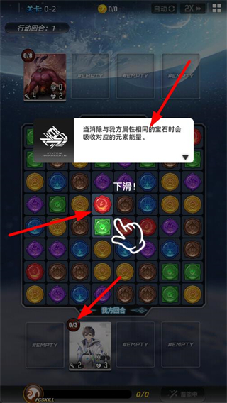 2、消除與我方屬性相同的寶石,會吸收對應的元素能量,積累這些能量可助力后續戰斗的技能釋放。