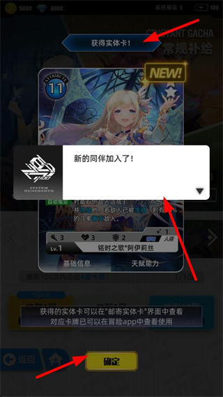 4、通過常規補給獲得新伙伴實體卡,查看其基礎信息與天賦能力后,點擊確定完成獲取,該伙伴可在冒險的過程使用。
