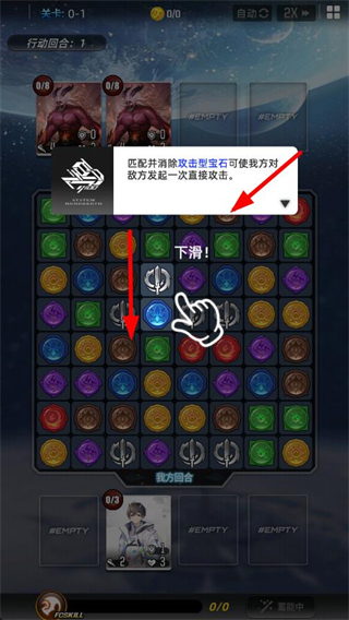 1、在寶石界面,匹配并消除攻擊型寶石,可讓我方對敵方發起一次直接攻擊,通過消除寶石推進戰斗進程。