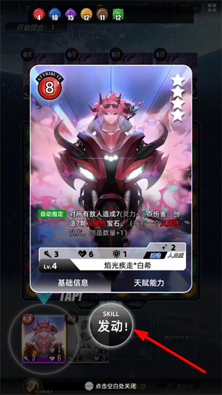 3、當伙伴的技能條件滿足后,點擊發動按鈕釋放技能,如焰光疾走白希的技能,能對所有敵人造成傷害并創造寶石。