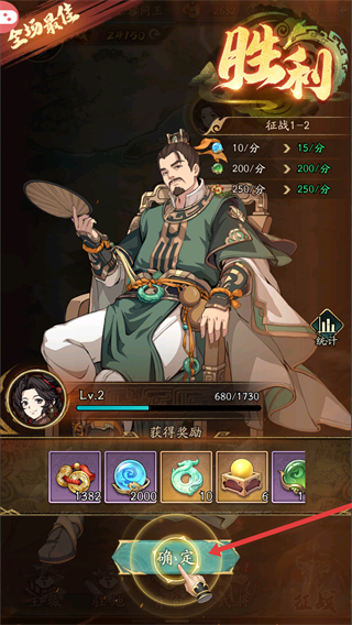 1、戰斗勝利后顯示勝利界面,可獲得金幣、道具等獎勵,點擊確定按鈕繼續游戲,提升角色等級,開啟新冒險。