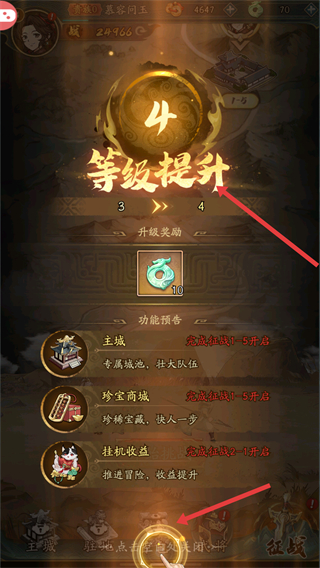 4、角色等級提升時會顯示等級提升界面,獲得升級獎勵,還會開啟主城、珍寶商城等新功能,豐富游戲玩法。