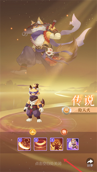4、獲得隱天犬等傳說妖靈后,可查看其技能等信息,點擊空白處關閉妖靈信息界面,繼續游戲操作。