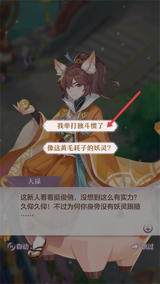 2、與天祿等角色對話時,可選擇我單打獨斗慣了等對話選項,推進對話劇情,了解游戲背景故事。