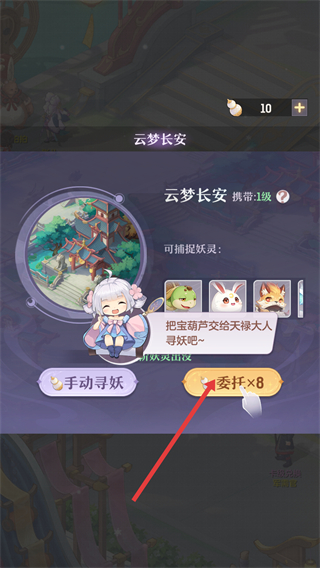 3、在尋妖界面,可選擇委托x8方式進行尋妖,把寶葫蘆交給天祿大人,完成尋妖相關任務。