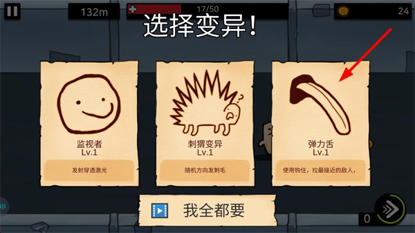4、達到指定進度后會出現選擇變異界面,可從監視者刺猬變異彈力舌之間選一個變異選項,獲取對應的能力,助力后續的關卡挑戰與成長。