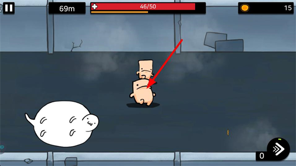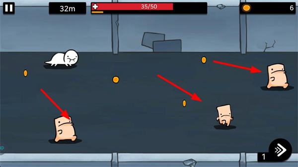 2、操控角色移動,在場景里收集金幣,同時靠近遇到的敵人,通過吃掉他們來恢復體力,推進關卡距離的同時積累資源。