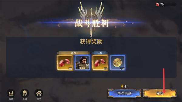 4、戰斗勝利后可獲得獎勵,點擊完成可領取獎勵,用于提升英雄或解鎖新防御設施,繼續挑戰后續關卡。