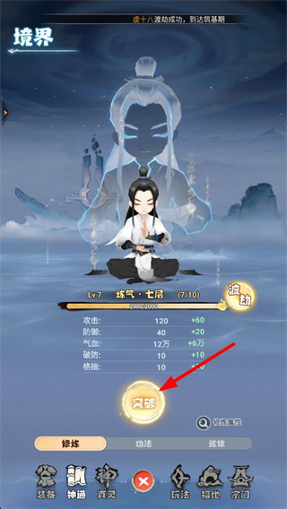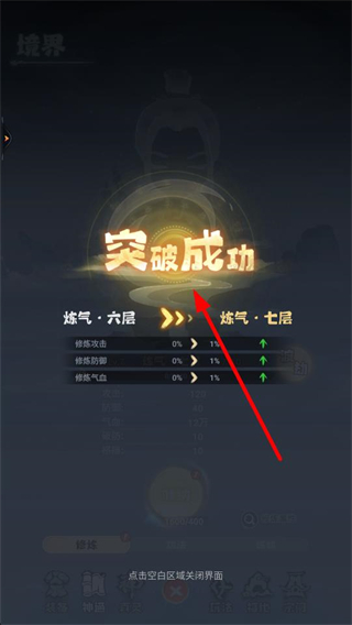 2、突破成功提升至煉氣七層,增強修煉攻擊、防御等屬性,優化角色的綜合能力,為對抗更強的修仙敵人提供助力。