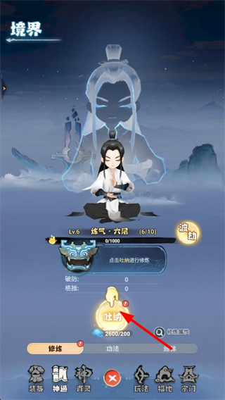 1、點擊此地進行修煉,提升角色的境界和戰力,為后續境界突破和修仙戰斗做好準備,推進御天修仙的進程。