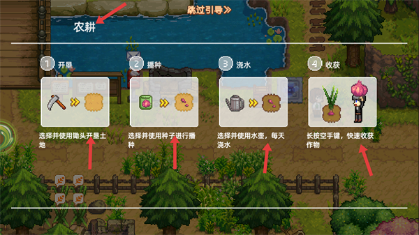 2、農耕有開墾、播種、澆水、收獲步驟,依次使用鋤頭翻土、種子播種、水壺澆水,等作物成熟后收獲。