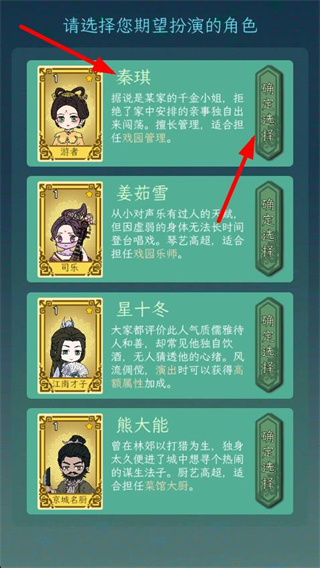 1、選擇期望扮演的角色,每個角色有不同的身份和擅長領域,選好后點擊確定選擇,即可開啟對應身份的戲園經營。